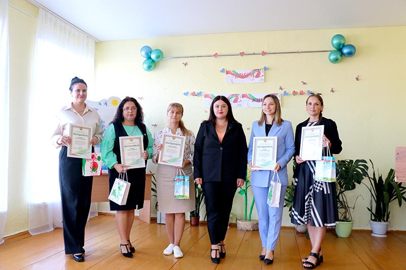 Наталья Судиловская за значительный вклад и активное участие в деятельности Климовичского РК ОО «БРСМ» вручила Благодарственные письма районного комитета, а также памятные подарки педагогам-организаторам Татьяне Александрович (гимназия), Анне Раковской (СШ № 3), Алене Казновой (СШ № 1), Наталье Исаченко (Роднянская СШ), секретарю первичной организации ОО «БРСМ» Климовичского КХП Татьяне Радевич.