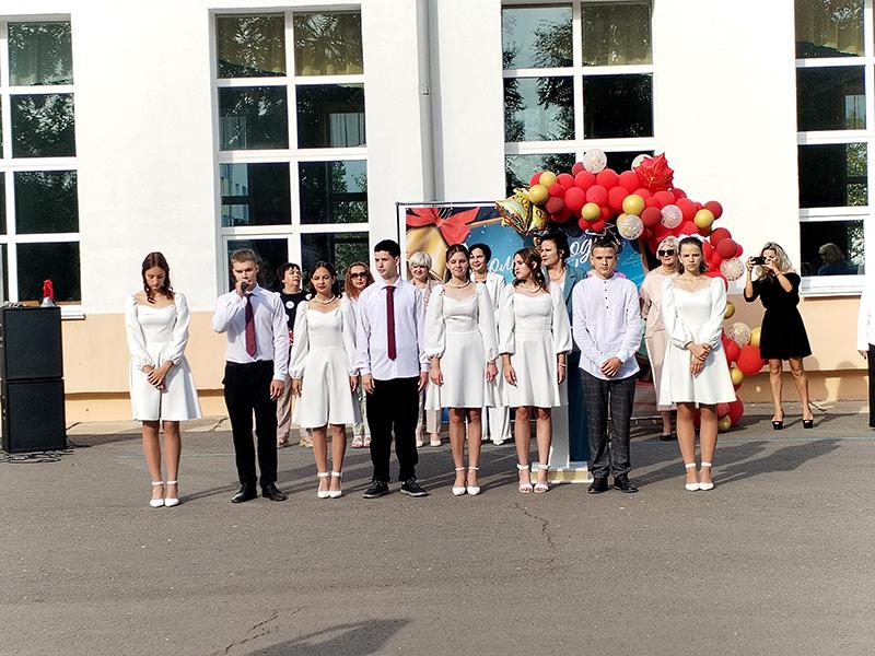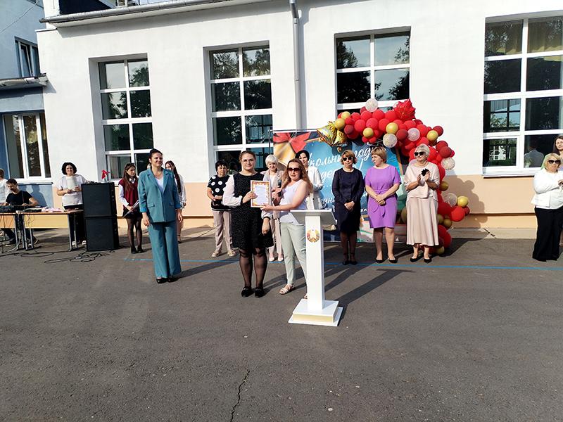 На торжественной линейке заместитель директора КХП по идеологической работе, кадрам и быту Татьяна Иванова вручила Благодарственное письмо педагогу школы, руководителю студенческого отряда Виктории Науменко за многолетний добросовестный труд в оказании помощи по благоустройству территории комбината. С 15 по 26 июля благоустройством территории КХП занимался отряд из 20 человек, состоящий из учащихся школы.