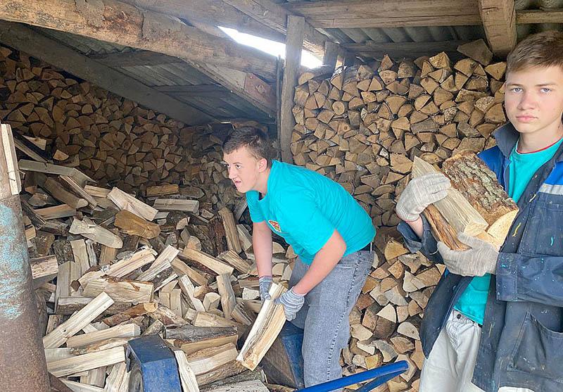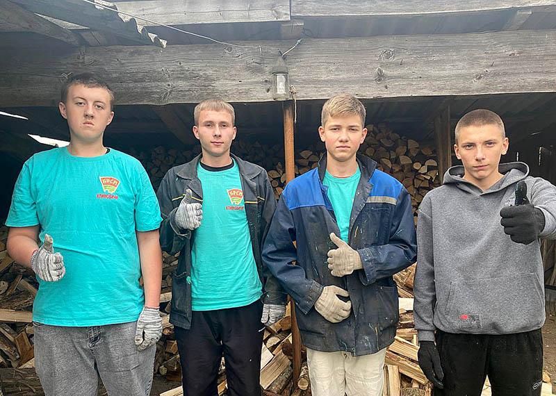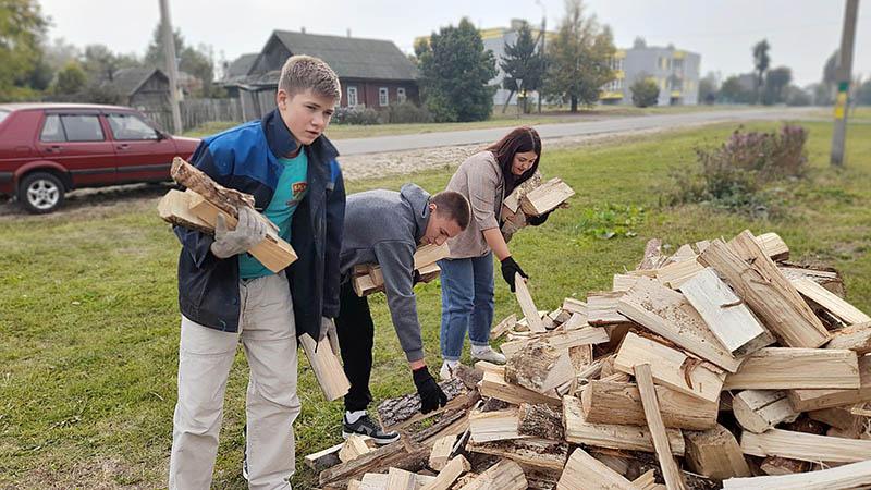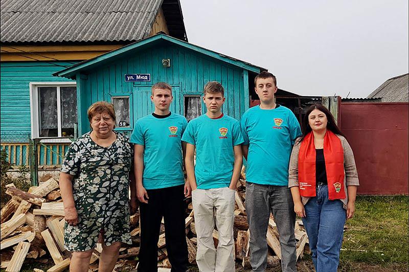 Владислав Мачехин, Владислав Германов, Ярослав Лаврущик, Игнат Юрченко из отряда «Руки помощи» вместе с первым секретарем районного комитета ОО «БРСМ» Натальей Судиловской откликнулись на просьбу помочь перенести дрова.