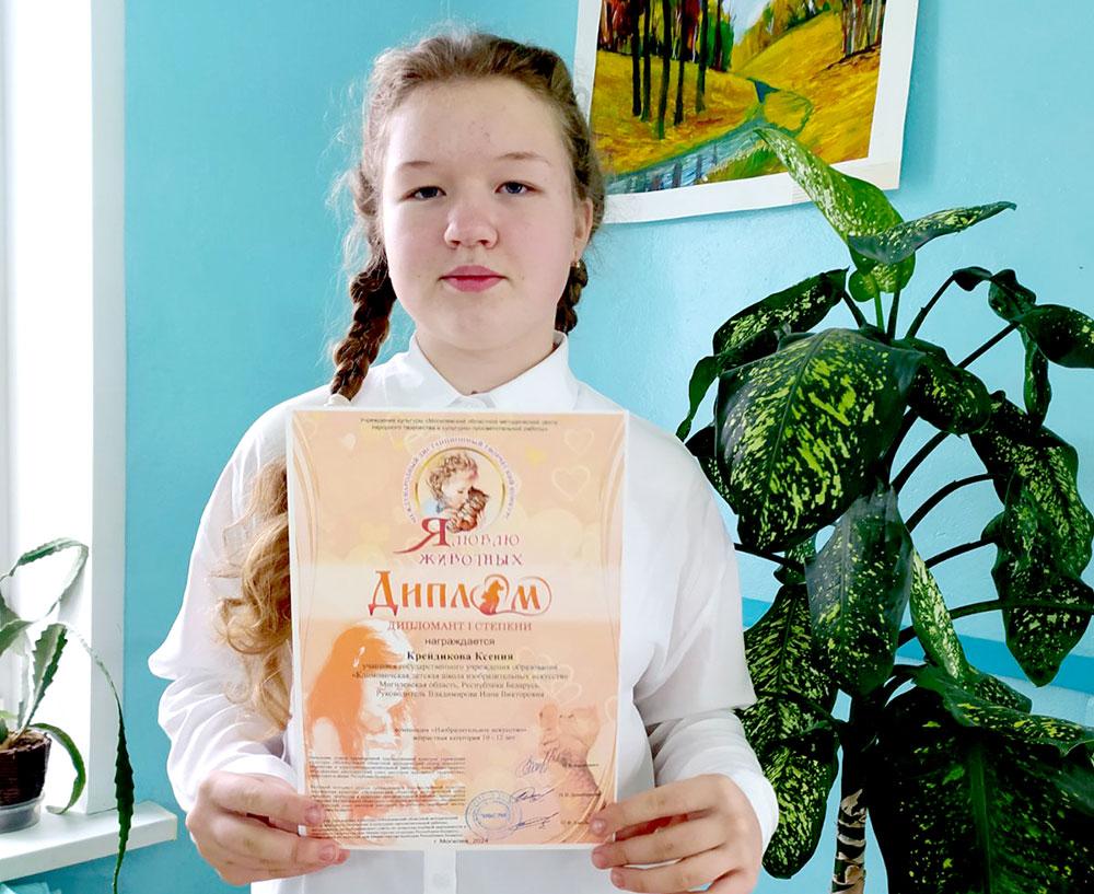 Недавно были подведены итоги конкурса. Отрадно, что среди победителей и призеров есть и климовичские юные художники. В номинации «Изобразительное искусство» Дипломом I степени отмечена работа Ксении Крейдиковой. Дипломы II степени получили Анастасия Говоритова, Ульяна Гололобова и Карина Почечуева, Диплом III степени — Варвара Михнова.