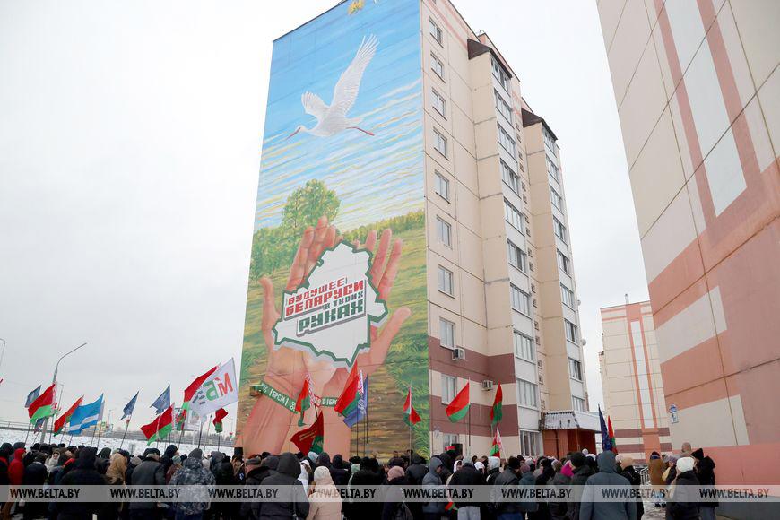 В Могилеве во время «Марафона единства» открыли новый тематический арт-объект «Будущее Беларуси в твоих руках». Он расположился на одном из многоквартирных домов по ул.Фатина. Такие муралы появляются в каждом городе, где проходит республиканская общественно-культурная акция.