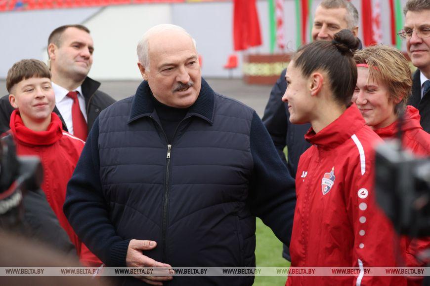 На поле Александр Лукашенко также пообщался с тренерами и юными футболистками клуба «Минск». Он рассказал, как в свое время занимался этим видом спорта и как в одной из игр травмировал колено, а спортсменки в свою очередь попросили главу государства оставить автограф на мяче — теперь он займет почетное место в музее клуба.