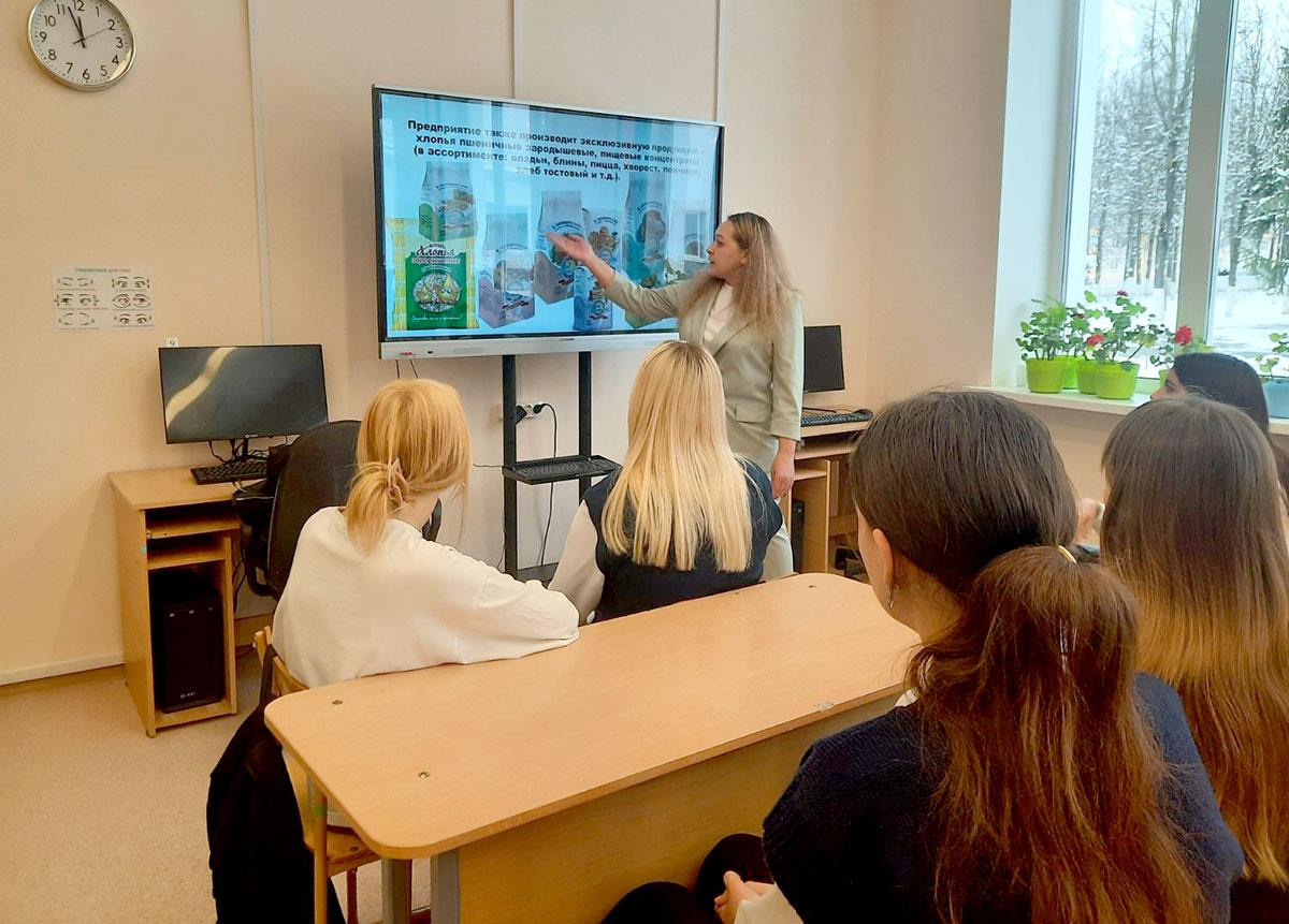 Заместитель директора по идеологической работе, кадрам и быту ОАО «Климовичский КХП» Татьяна Иванова встретилась с учащимися средней школы № 4 г. Климовичи. В режиме открытого диалога Татьяна Вениаминовна провела онлайн-экскурсию по производственным объектам предприятия, ознакомила школьников с имеющимися вакансиями, рассказала, где можно получить соответствующее образование для работы в открытом акционерном обществе.