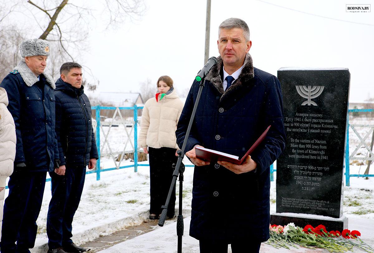 На митинг-реквием, посвященный Международному дню памяти жертв преступления геноцида, у памятника на ул. Бирюзова в Климовичах собрались представители органов власти, трудовых коллективов, общественности.