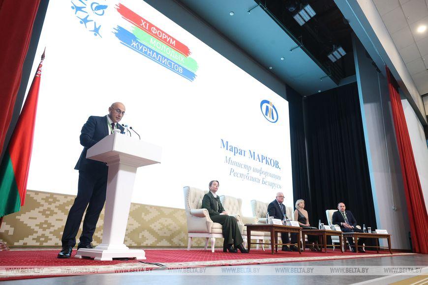 «Молодому журналисту сегодня предоставлено то, чего не было еще полтора-два десятка лет назад, широчайший выбор поля деятельности. Только у республиканских белорусских СМИ более 7,5 млн подписчиков. Стремительно развивается ТикТок, у которого в Беларуси прирост подписчиков только по районным редакциям СМИ за 12 месяцев — 50% — до 2 млн. Но вопрос: а кто из вас может назвать еще полтора десятка социальных сетей, которые нужно не только знать, но еще и работать с ними, потому что там подписчиков у них десятки и сотни миллионов человек? Об этом тоже сегодня, надеюсь, мы успеем поговорить, — дополнил Марат Марков. — Выбирайте свою нишу, развивайтесь в ней профессионально. Не стремитесь окунаться исключительно, как это сейчас преобладает, в культурную или спортивную сферу. Да, там тоже надо работать. Но все-таки выбирайте политику. Это сложный путь и при этом вам будет очень интересно. Да, вы будете сталкиваться, а кто-то уже, я уверен, столкнулся с определенными вызовами: дезинформацией, давлением, санкциями, попытками запугать и закрыть вам рот. Но это вызовы, а для журналиста вызовы — это всегда возможность. Именно в таких условиях ваша профессия проявляет свое особое значение — служения обществу, преданности своей стране. Вы же понимаете, что придя в журналистику, вы уже выбрали путь, который требует не только таланта, но и профессионального долга перед страной и людьми, а еще смелости и самоотверженности».