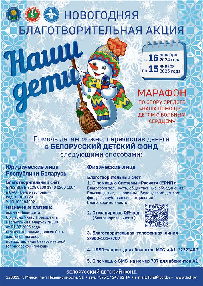 В этом году общереспубликанская благотворительная акция «Наши дети» стартовала 16 декабря. Она проводится в 29-й раз. Акция позволяет привлечь внимание к проблемам детства, оказать помощь и поддержку наименее защищенным категориям маленьких граждан страны, нуждающимся в особой заботе и внимании. В мероприятиях акции также участвуют ребята, которые достигли высоких результатов в учебе, общественной, культурной и спортивной деятельности. Главная цель взрослых — дойти до каждого ребенка, чтобы дети почувствовали настоящий праздник.