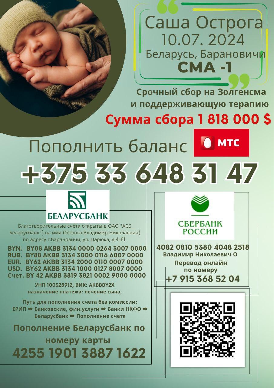 22 ноября 2024 года маленькому Саше Острога (10.07.2024 года рождения) был поставлен диагноз спинальная мышечная атрофия 1 типа. Заболевание СМА – наследственное нейромышечное заболевание, характеризующееся прогрессирующей мышечной атрофией. СМА1 – это наиболее тяжелая форма, которая обычно приводит к нарушению дыхания и глотания.