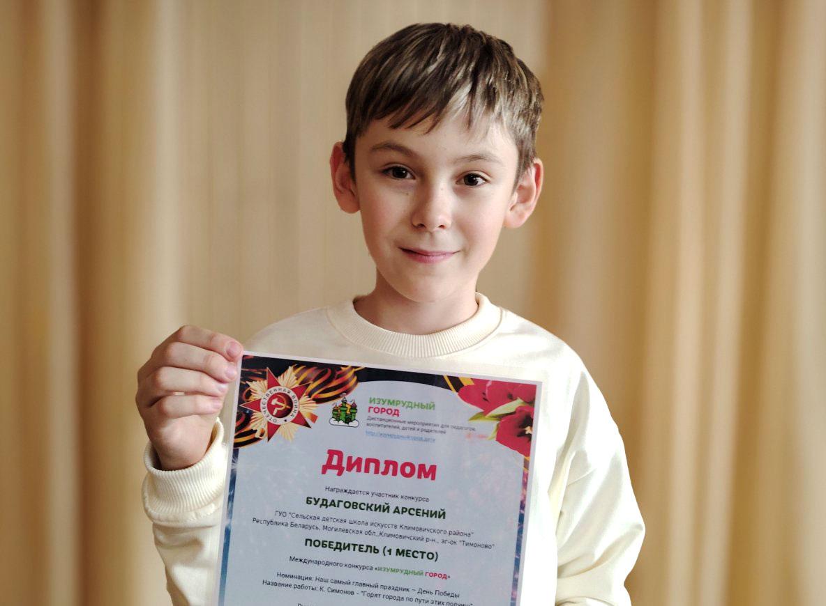 В номинации «Наш самый главный праздник — День Победы» Арсений Будаговский (театральное отделение), воспитанник Елены Ботыровой, награжден Дипломом за первое место.
