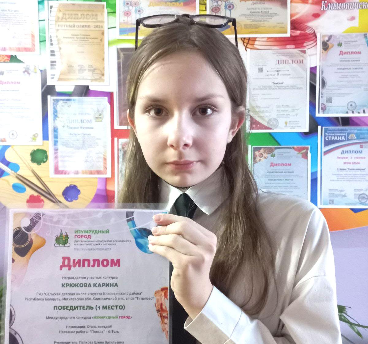 Также Дипломом первой степени награждена Карина Крюкова. Талантливая девушка занимается по классу аккордеона у преподавателя Елены Папковой.
