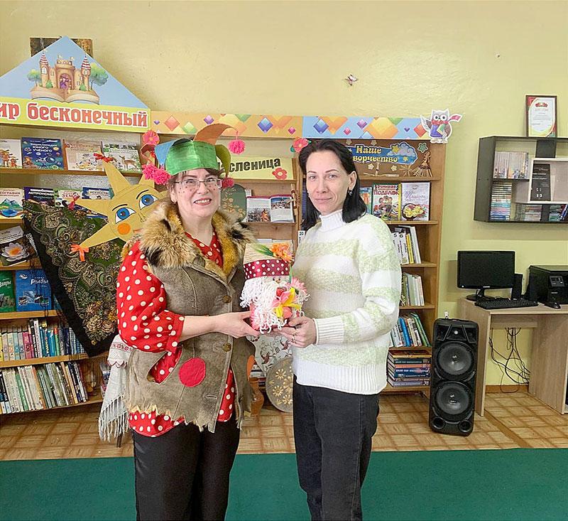 Не обошлось в библиотеке без театрализованного праздничного представления с героями масленичных гуляний. Гостей встречали, в исполнении сотрудников библиотеки, веселый скоморох Ероха и Забава, а прекрасную девушку Весну и саму барышню Масленицу сыграли сотрудники Тимоновского сельского Дома культуры.