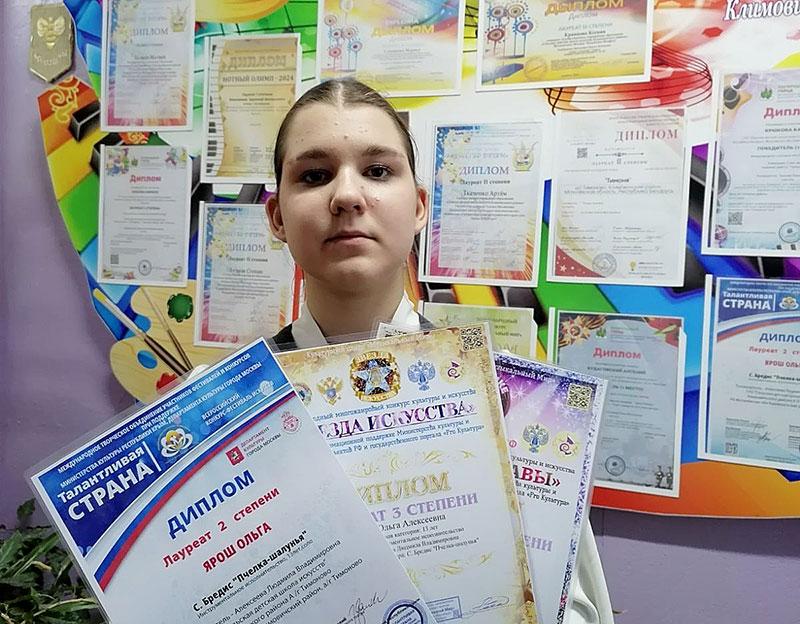 Как рассказала директор учреждения образования Ирина Дорошкова, в этом году копилка достижений юного таланта пополнилась сразу тремя наградами. За участие в Международном многожанровом конкурсе культуры и искусства «На пике славы» девочка награждена Дипломом лауреата I степени. Также Ольга приняла участие во Всероссийском конкурсе-фестивале искусств «Талантливая страна». Там баянистка получила Диплом лауреата II степени. А еще воспитанница сельской детской школы искусств стала обладателем Диплома лауреата III степени за участие в Международном многожанровом конкурсе культуры и искусства «Звезда искусства».