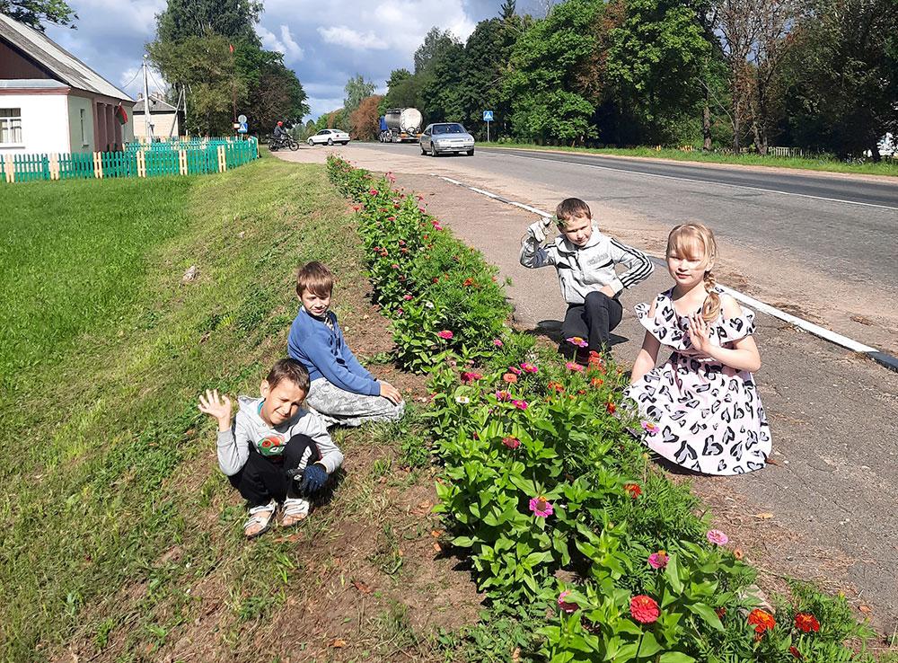 В прошлом году у ребят возникла идея разбить в агрогородке вдоль дороги красивую клумбу. Обратились в сельский Совет. Председатель сельисполкома Сергей Салобуто помог определить место. Приступили к осуществлению плана. Выпускники Елены Александровны, учащиеся 8 и 11 класса, также подключились к делу. Так общими усилиями освободили почву от дерна, сформировали клумбу и высадили цветы. Но при этом проделали исследовательскую работу: взяли пробу почвы, определили, какие для данной почвы больше подходят цветы. Как выяснилось, самые подходящие виды — бархатцы и циннии.