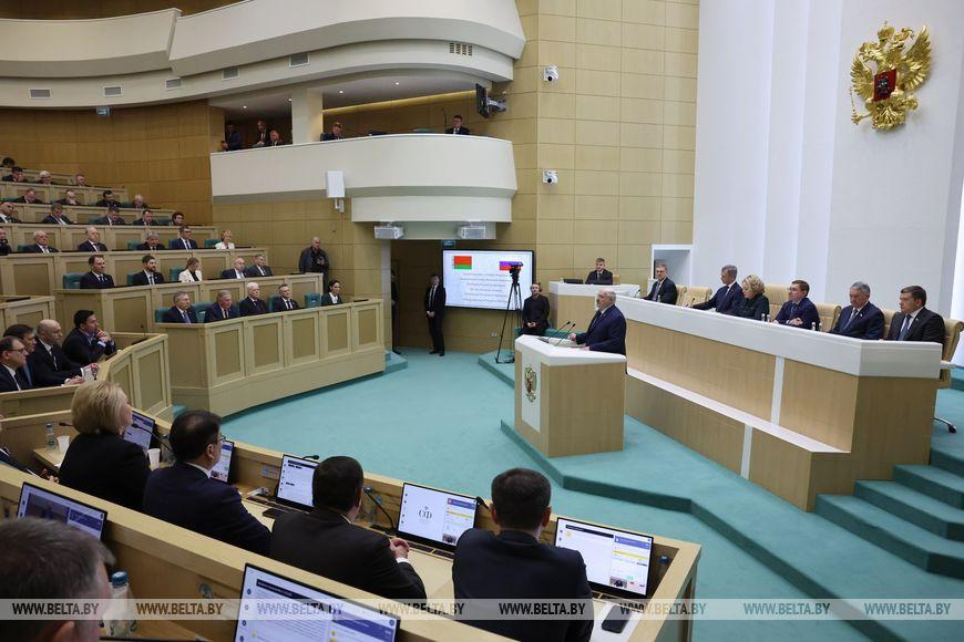 Александр Лукашенко впервые выступил в Совете Федерации — верхней палате российского парламента. Основная тема президентской речи перед сенаторами — союзное строительство с Россией. Этот процесс, подчеркнул он, нужно сделать необратимым.