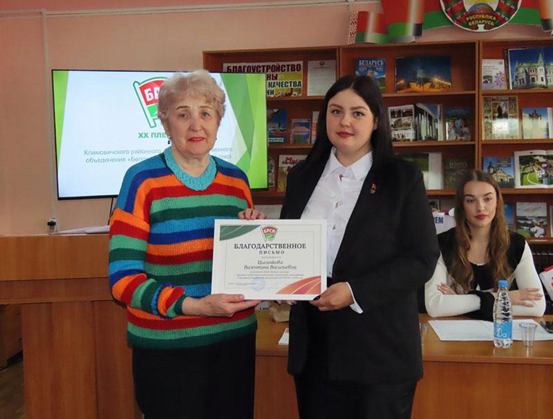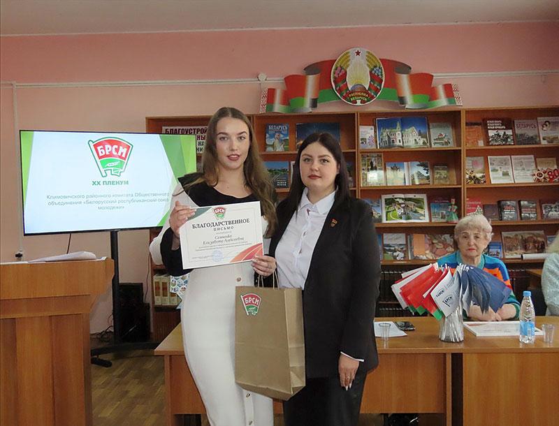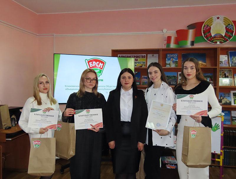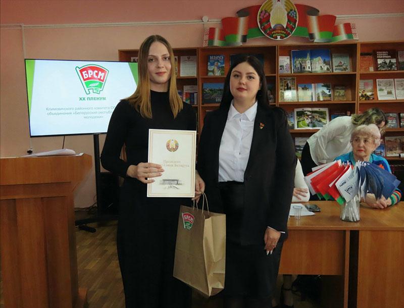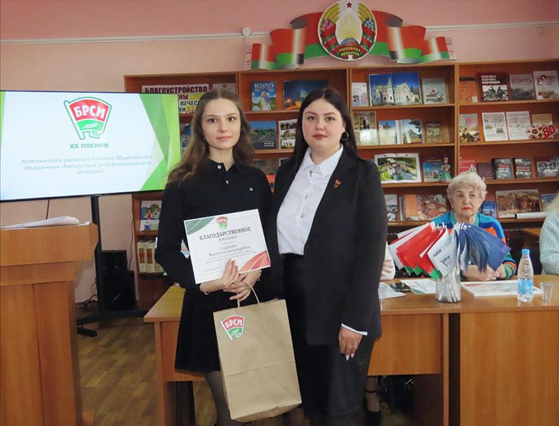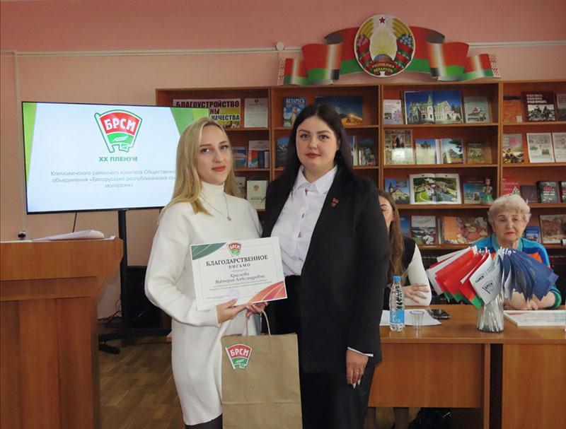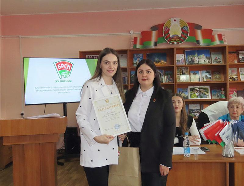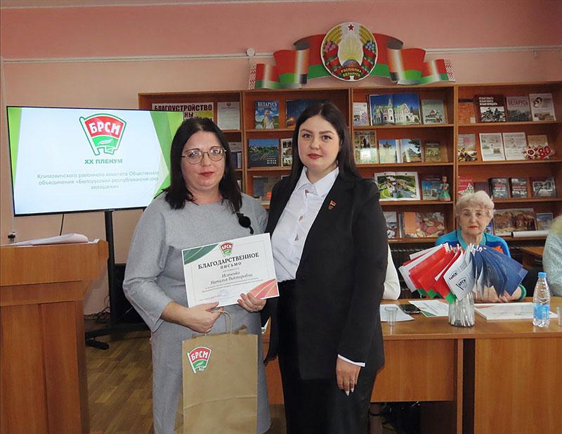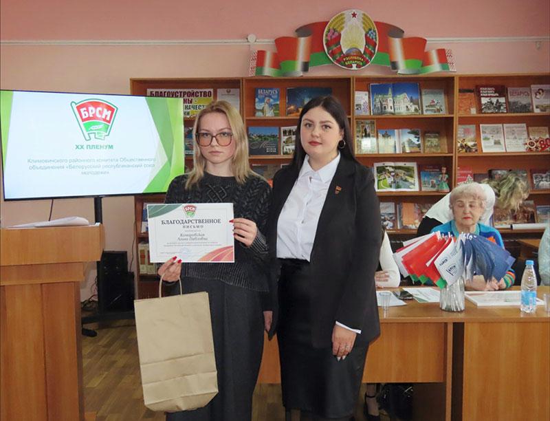 Благодарностью Климовичского райкома ОО «БРСМ» за активную общественную позицию, оказание содействия в проведении тематических мероприятий отмечены главный специалист отдела идеологической работы и по делам молодежи Климовичского райисполкома Ольга Сухарева и председатель районной ветеранской организации Валентина Цыганкова.