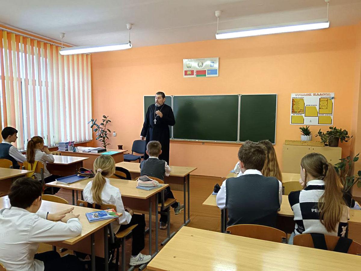 Беседу о духовных ценностях с шестиклассниками провел священнослужитель Свято-Михайловского храма отец Сергий.