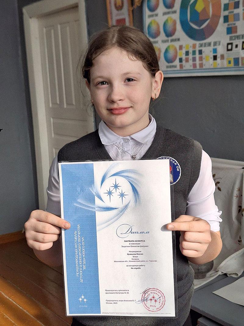 Учащиеся художественного отделения приняли участие в Международном фестивале детского творчества «Звезды нового века». В номинации «Защитник Отечества» Дипломами лауреатов отмечены Кристина Володкович, Ксения Кравцова, Владислав Ковалев. В номинации «Пришла волшебница Зима» Диплом лауреата конкурса у Лилии Гребенюковой.