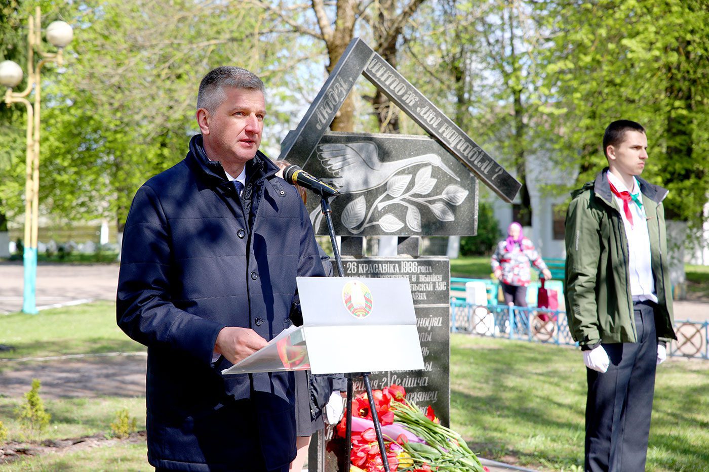 День чернобыльской трагедии болью отзывается в сердцах белорусов. Небольшой город Припять 39 лет назад стал местом самой крупной в истории человечества техногенной аварии. Больше других от последствий взрыва на ЧАЭС пострадала наша республика. Об этом в своем выступлении говорил председатель райисполкома Виктор Пугач на митинге-реквиеме в агрогородке Тимоново.