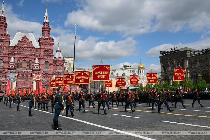 Главное праздничное событие в Москве, конечно, состоялось непосредственно 9 Мая — парад Победы на Красной площади. Парадным расчетом по брусчатке у стен Кремля прошли представители вооруженных формирований стран СНГ и армий из других дружественных государств. Александр Лукашенко стоя приветствовал белорусских военнослужащих.