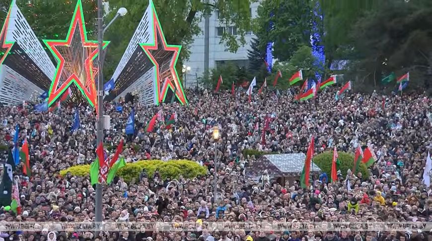 Вечером в Минске у стелы «Минск — город-герой», уже в военной форме, как и положено Главнокомандующему, Александр Лукашенко принимал белорусский парад, в котором также принимали участие представители ряда стран СНГ, включая Россию, а также военнослужащие из Китая.