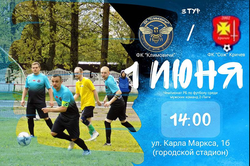 1 июня на городском стадионе Климовичей (ул. Карла Маркса, 1б) состоится футбольный матч в рамках регионального этапа первенства Могилевской области второго дивизиона (группа «Б»). В этот день на поле встретятся команды ФК «Климовичи» и ФК «Сож» (Кричев).