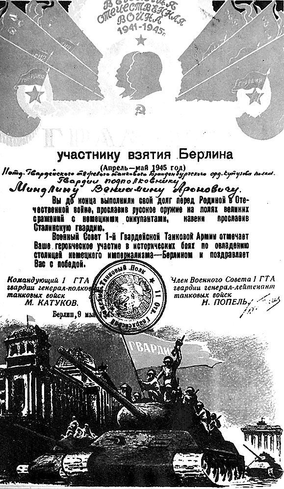 Миндлин Вениамин Аронович, гвардии подполковник, командир 1 гвардейской танковой бригады, командир 11 гвардейского тяжелого танкового полка.