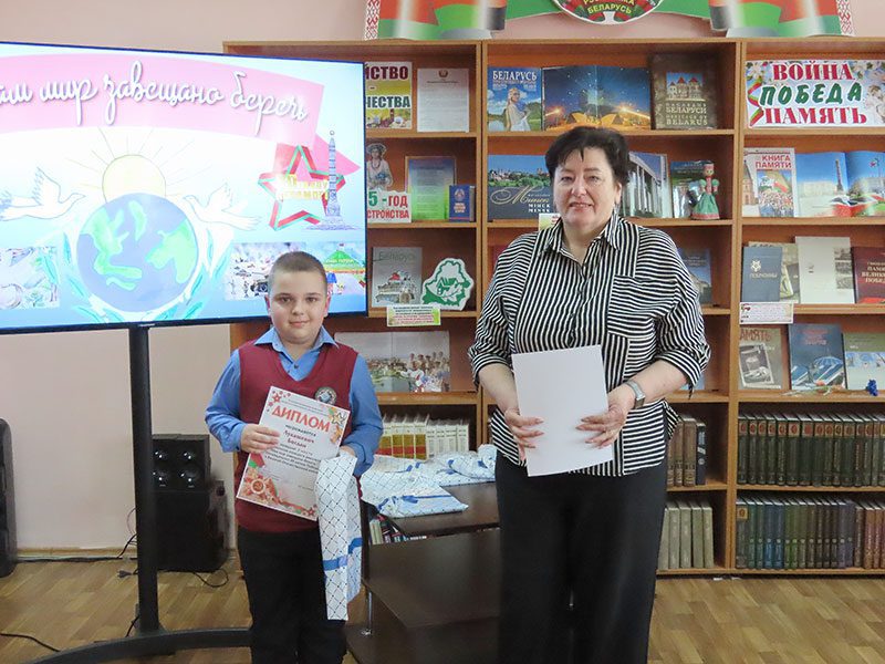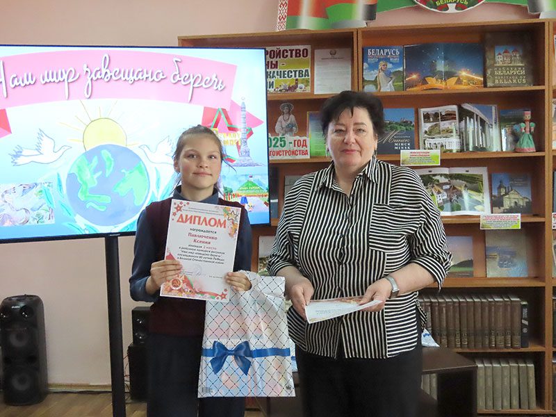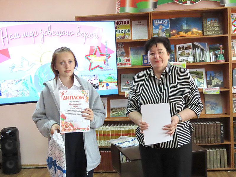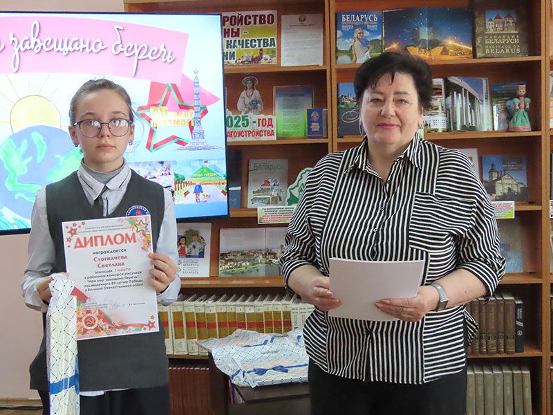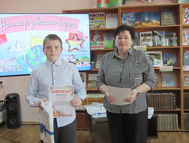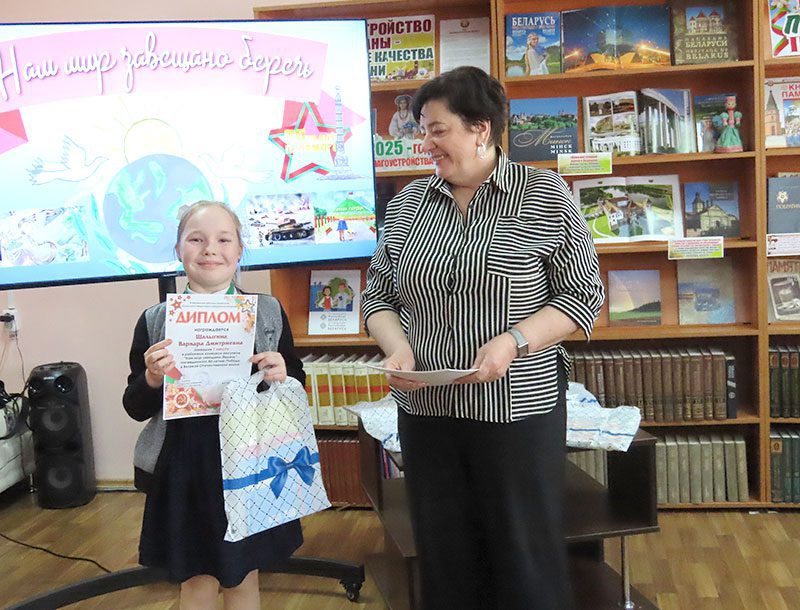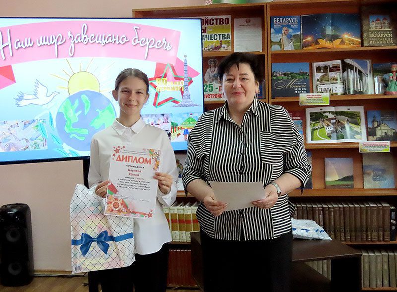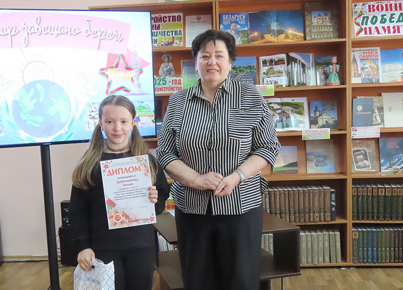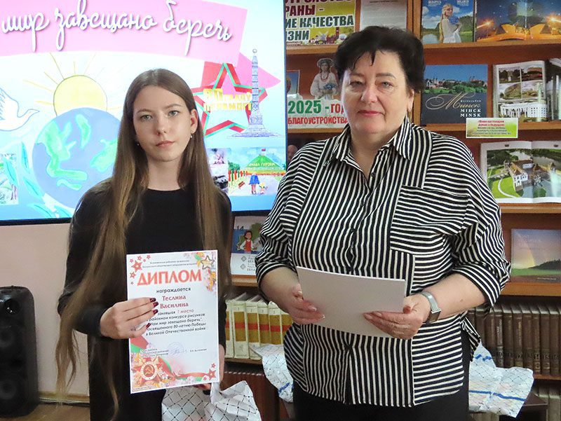 В центральной районной библиотеке ответственный секретарь районной ветеранской организации Галина Сильченко вручила дипломы и подарки участникам районного этапа конкурса «Нам мир завещано беречь», посвященного 80-летию Победы в Великой Отечественной войне.