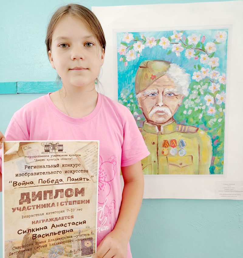 Юная климовчанка Анастасия Силкина стала обладательницей диплома первой степени регионального конкурса изобразительного искусства «Война. Победа. Память». В возрастной категории 7–10 лет ее работа, на которой изображен солдат Советской армии с медалями и цветущими ветвями яблони, покорила жюри своей колоритностью и глубиной замысла.