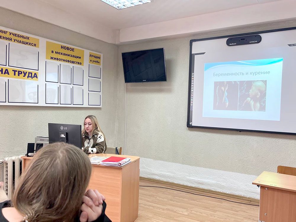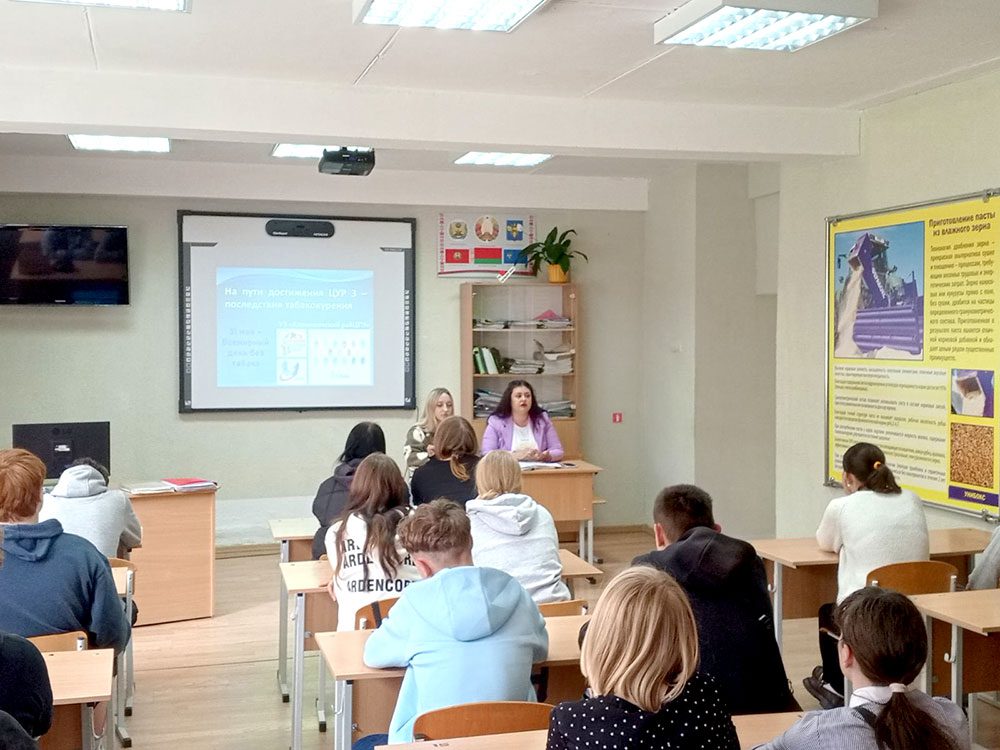 В рамках республиканской акции «Беларусь против табака» в УО «Климовичский государственный аграрный колледж» инструктор-валеолог УЗ «Климовичский райЦГЭ» Виктория Краснова и первый секретарь РК ОО «БРСМ» Наталья Судиловская для учащихся колледжа провели круглый стол «На пути достижения ЦУР 3 — последствия табакокурения». Напомним, что Цель 3 в области устойчивого развития «Обеспечение здорового образа жизни и содействие благополучию для всех в любом возрасте» является одной из 17 Целей в области устойчивого развития, установленных ООН в 2015 году.