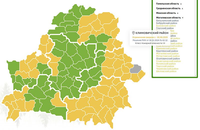 Ограничение на посещение лесов введено в Климовичском районе с 1 июня текущего года. Об этом свидетельствуют данные интерактивной карты Министерства лесного хозяйства.