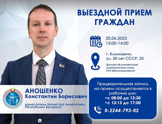 20 июня 2025 года заместитель Министра энергетики Константин Борисович Аношенко проведет выездной прием граждан.