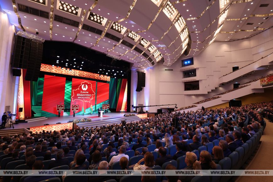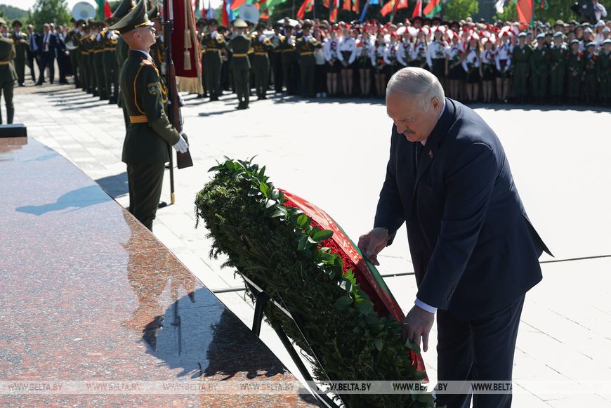 Президент отметил, что для большинства белорусов главный государственный праздник означает мир. В этот день вспоминают жертв войны, чествуют ветеранов войны и труда, чьи стойкость, мужество и любовь к Родине будут всегда примером для нынешнего и будущих поколений. Память о подвиге непокоренного народа — вопрос национального достоинства, без которого разговоры о независимости, суверенитете, свободе — просто слова.