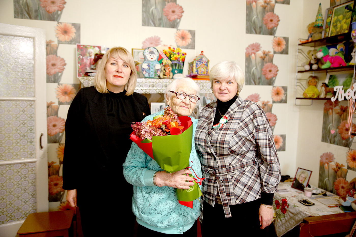 Труженица тыла Любовь Ефимовна Прудкова накануне Дня освобождения Климовщины от немецко-фашистских захватчиков принимала искренние поздравления с наступающим праздником от заместителя председателя райисполкома Марии Мордесовой и начальника управления по труду, занятости и социальной защите райисполкома Алеси Белькиной.