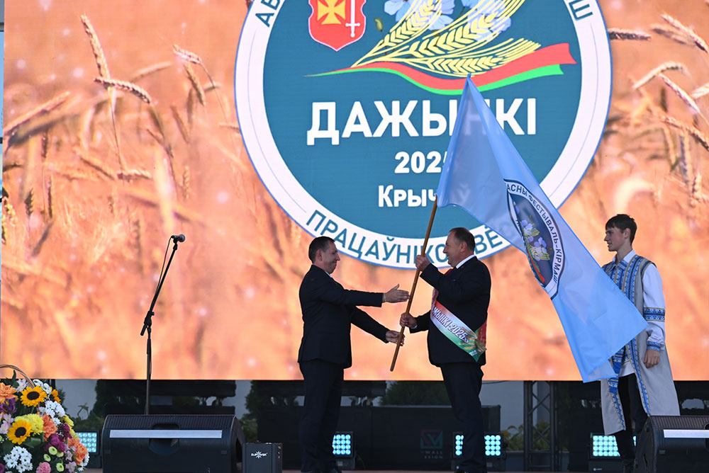 На праздничном концерте «Дажынак-2025» в Кричеве состоялась торжественная передача символа фестиваля-ярмарки тружеников села — знамени «Дажынкi». Эстафету принял Шклов, который станет хозяйским городом мероприятия в следующем году.