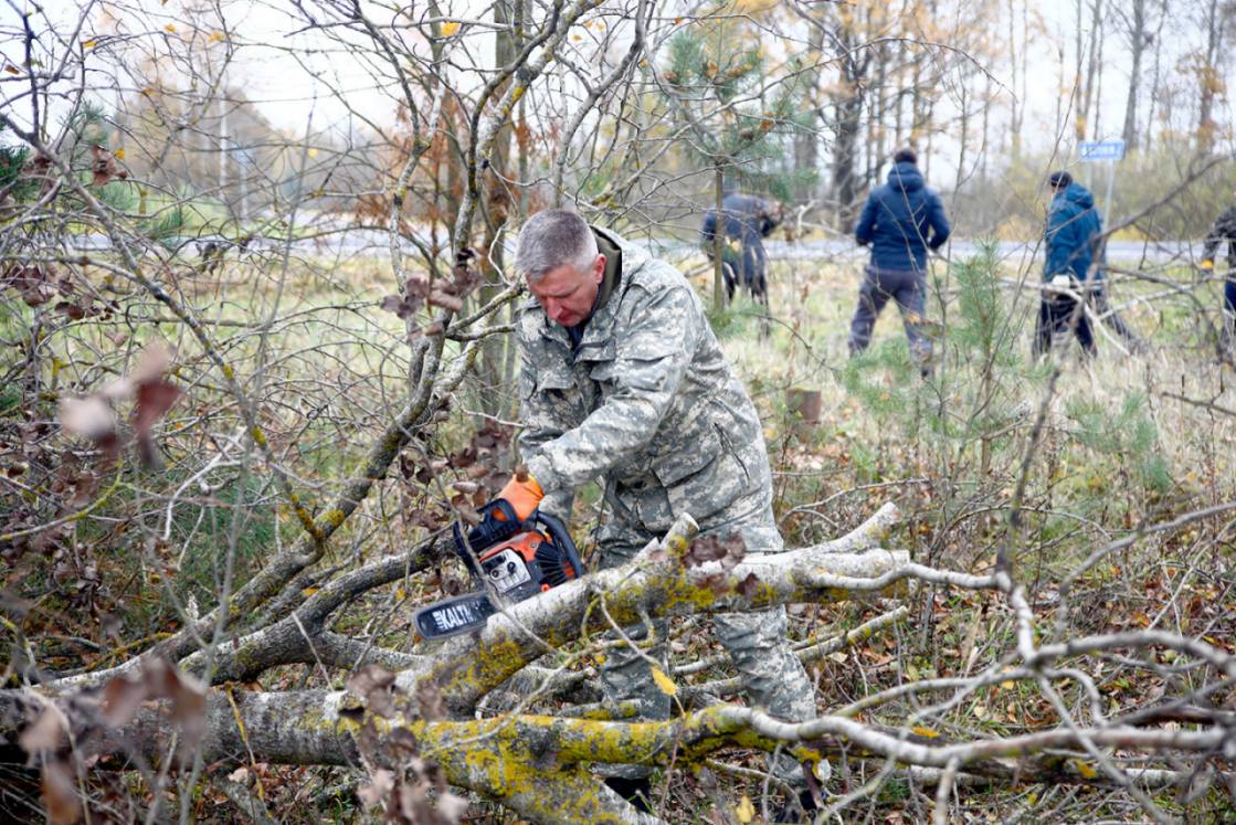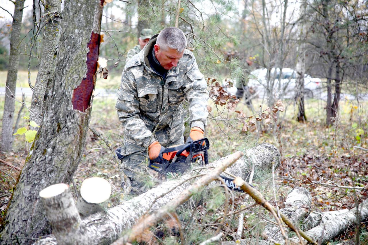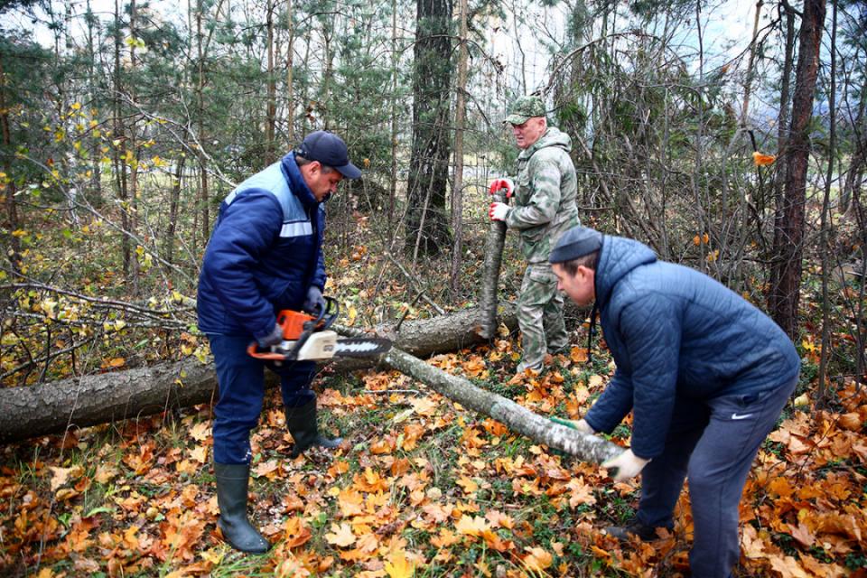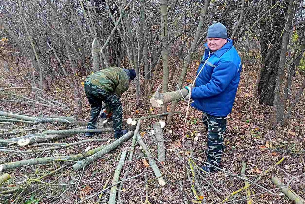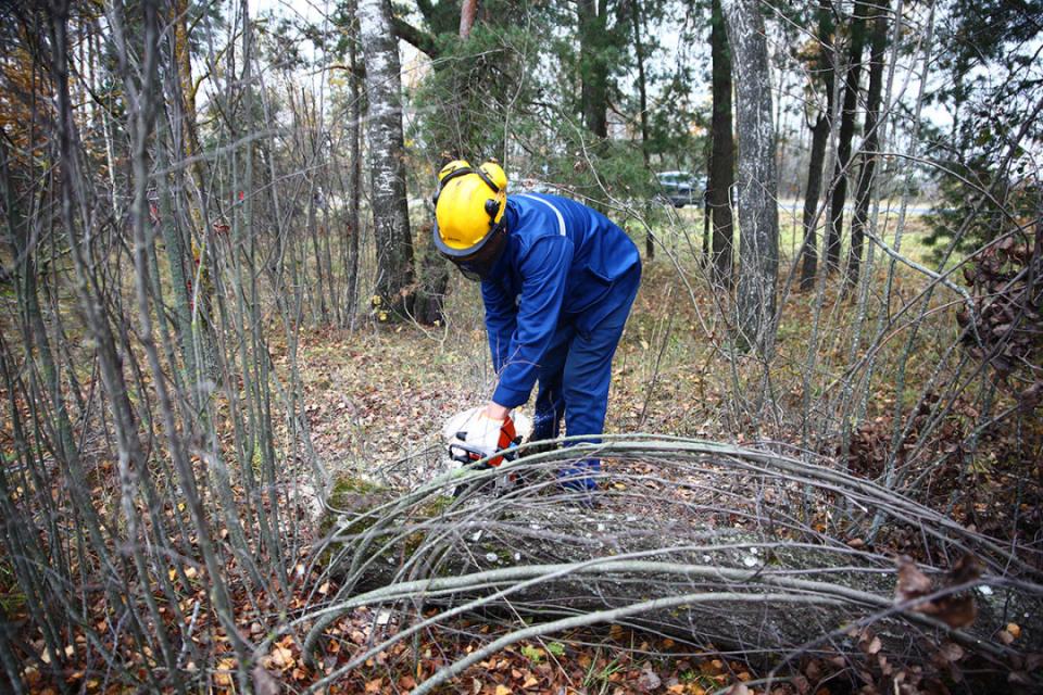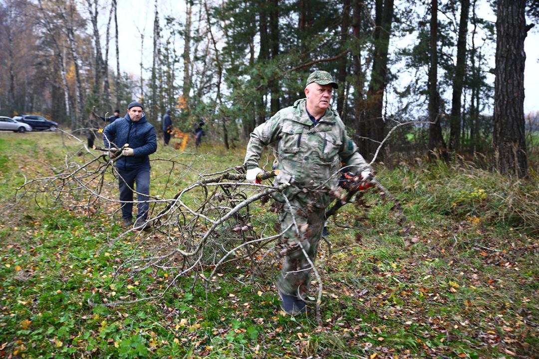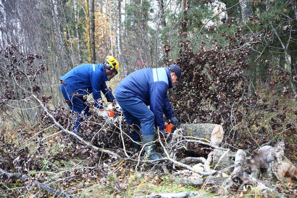 Сегодня председатель райисполкома Виктор Пугач вместе с руководителями предприятий и организаций вырубают дикорастущую растительность и ликвидируют аварийные деревья на придорожной полосе участка автотрассы Хотовиж — Климовичи.