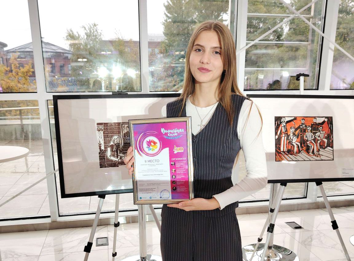 Анне был вручен Диплом II степени в номинации «Вечный огонь — вечная память». В возрастной категории от 11 до 14 лет. Свою линогравюру «Письмо сыну» она создавала под руководством учителя ДШИИ Натальи Семченко.