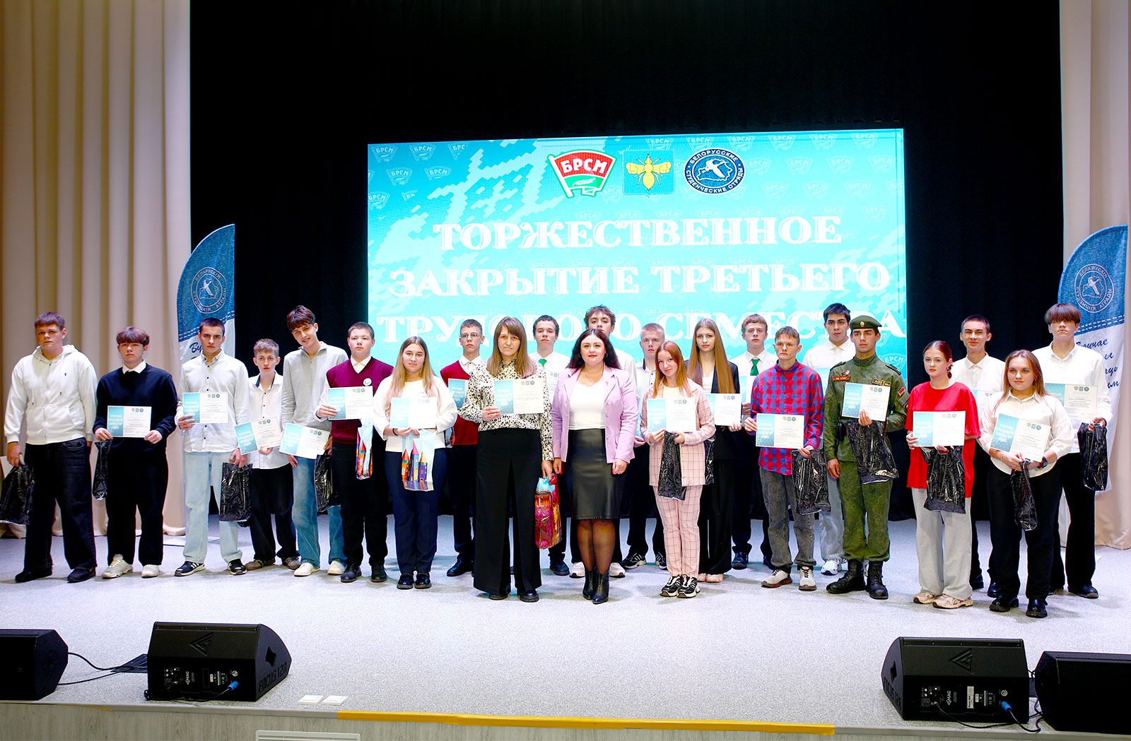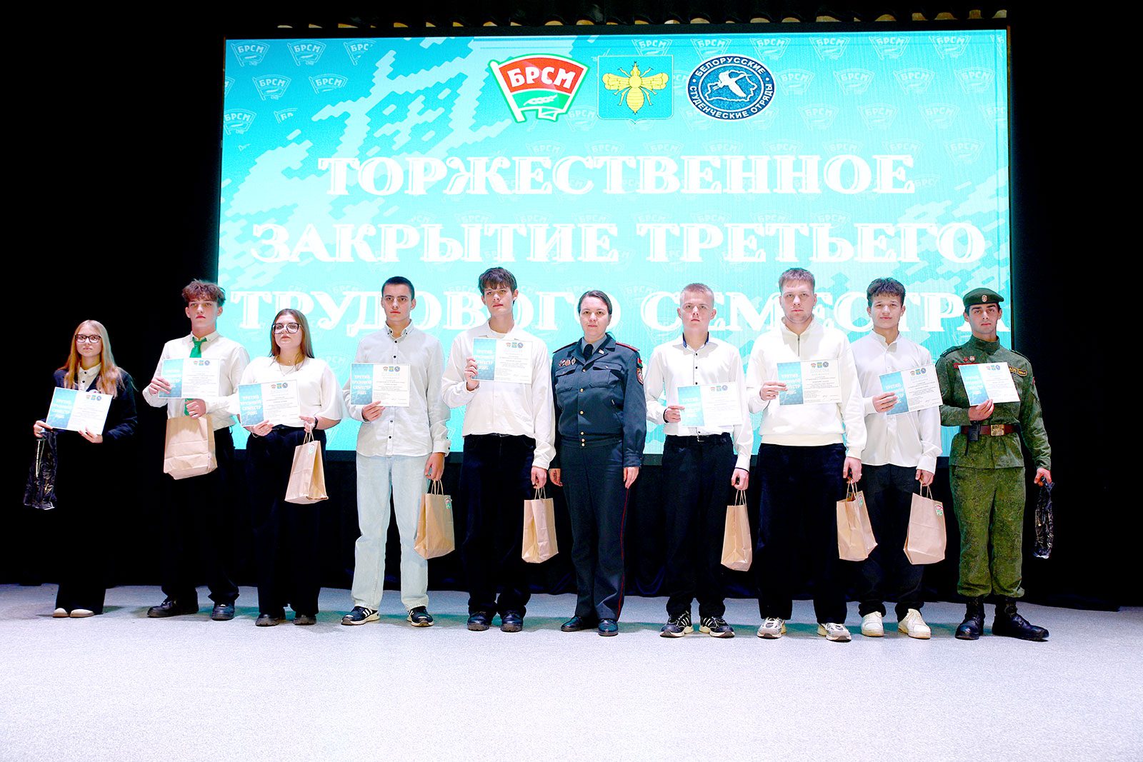 Первый секретарь РК ОО «БРСМ» Наталья Судиловская поздравила с трудовой победой лучших бойцов студенческих отрядов. Дипломами награждены Егор Тимощенко, Варвара Болиджан, Александр Каунев, Арсений Кабанов, Никита Комиссаров, Дмитрий Семченко, Матвей Чернобаев, Ксения Попкова, Татьяна Макарова, Евгений Григорович, Полина Андреенко, Евгений Изотов, Анна Огородникова, Александр Лебедев, Артур Гатальский, Матвей Гапеев, Богдан Яворский, Владислав Павлюченко, Антон Даниленко, Матвей Титов, Дмитрий Немкин, Арина Кухарева.