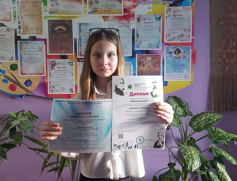 Не осталась без наград и Карина Крюкова (класс аккордеона), которая стала обладательницей дипломов лауреата I степени сразу на двух престижных международных конкурсах: VIII Международный творческий конкурс «Осенняя сказка» и Международный конкурс «Изумрудный город».