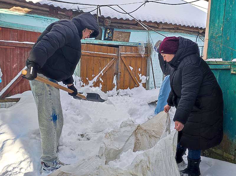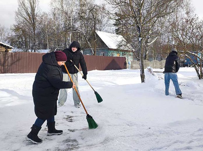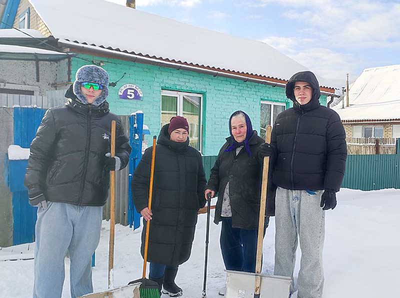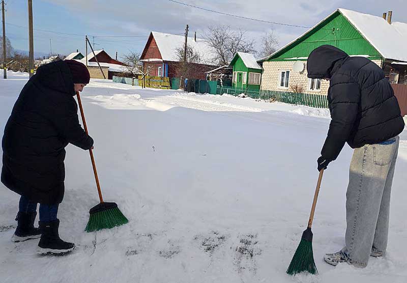 Климовчане принимают активное участие в «Эстафете тепла». Волонтеры БРСМ из четвертой городской школы — Максим Галов, Антон Даниленко, Лина Подобед вместе с социальным работником Зоей Ивановой помогли пожилым женщинам Евгении Мышковской и Марии Старовойтовой в расчистке снега на придомовых территориях.