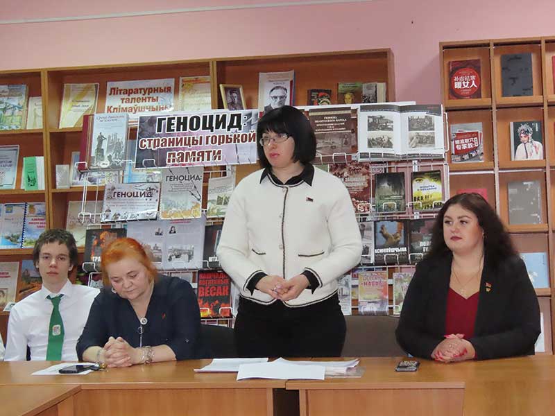 В преддверии Международного дня памяти жертв преступления геноцида, библиотекарь отдела маркетинга, социокультурной деятельности и методической работы районной центральной библиотеки Елена Железняк рассказала юношам и девушкам о геноциде белорусского народа. О том, что из себя представляли лагеря смерти и какие были на территории Республики Беларусь разъяснила заведующий отделом обслуживания и информации Климовичской центральной районной библиотеки имени И. Пехтерева, лектор РГОО «Знание» Ольга Максимович. Также Ольга Викторовна рассказала, какие книги, имеющиеся в библиотеке, можно почитать по теме геноцида.