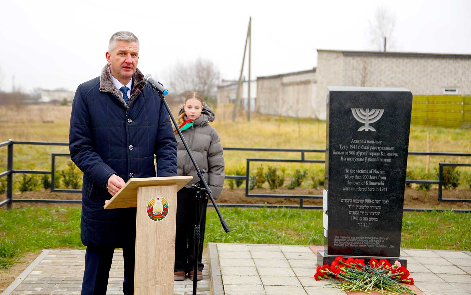 — Сегодня, 9 декабря, — Международный день памяти жертв геноцида, и мы снова вспоминаем события Великой Отечественной войны, которая оставила белорусскому народу тяжелое наследие — память о страшных трагедиях людей, ставших свидетелями и жертвами чудовищных преступлений фашизма, — отметил в своем обращении к участникам митинга глава района Виктор Пугач. — В годы войны на территории нашей страны погибло более 800 тысяч евреев. На этом месте в Климовичах 6-7 ноября 1941 года произошел самый массовый расстрел мирного населения. Оккупанты убили свыше 900 климовчан.