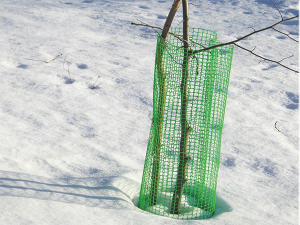 Обглоданная кора — это не просто царапина. Если грызуны съедают кору по кругу, дерево погибает. Поэтому, важно не ждать первых снегов, а подготовиться к защите сада. Самый надежный способ сохранить деревья зимой — защитить их физически, создав прочный барьер между корой и грызунами. Самый распространенный вариант — плотная мешковина или агроволокно. Ткань пропускает воздух и влагу, но при этом надежно укрывает кору от мороза и грызунов. Ее оборачивают вокруг ствола от уровня земли до нижних ветвей, фиксируя шпагатом или мягкой проволокой. Главное — не затягивать слишком плотно, чтобы не нарушить дыхание коры. Хорошо зарекомендовала себя и пластиковая сетка с мелкими ячейками. Ее устанавливают вокруг ствола на расстоянии 2-3 сантиметра, слегка заглубляя нижний край в землю. Такая защита особенно эффективна против зайцев: животное не может добраться до ствола даже при высоком снеговом покрове. Сетку поднимают до высоты не менее одного метра, а лучше — до 1,2-1,5 метра, поскольку зимой уровень снега часто оказывается выше ожидаемого.
