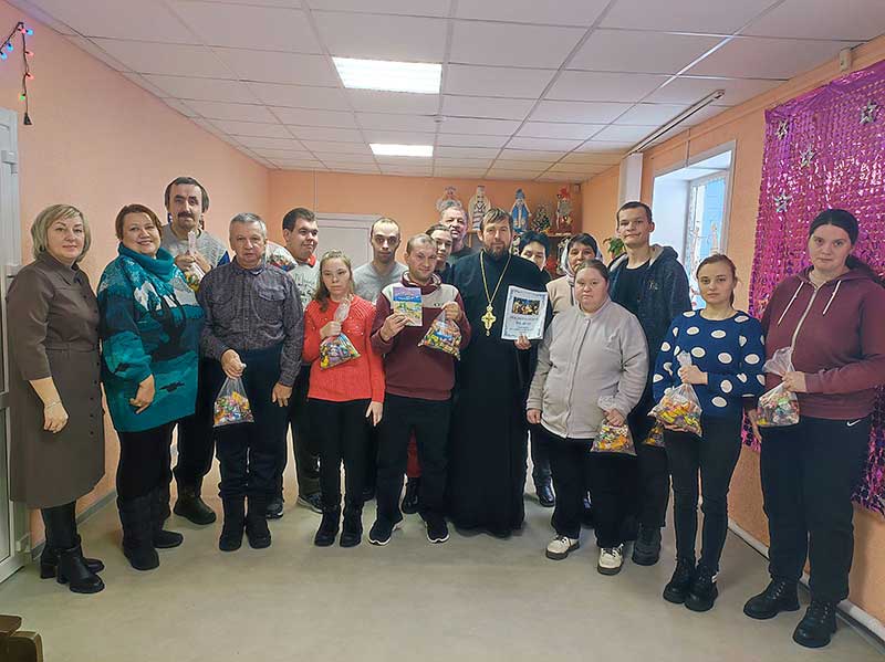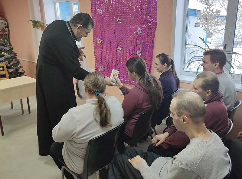 В этот же день протоиерей Николай и иерей Сергий посетили отделение социальной реабилитации, абилитации инвалидов и дневного пребывания для пожилых граждан Климовичского РЦСОН. Они рассказали посетителям отделения об истории значимых двунадесятых праздников Рождества Христова и Крещения Господня, об основных принципах православия, христианских добродетелях, важности посещения церкви и молитвы, а также познакомили слушателей с религиозной литературой. В завершение встречи все вместе исполнили рождественскую песню и получили подарки.