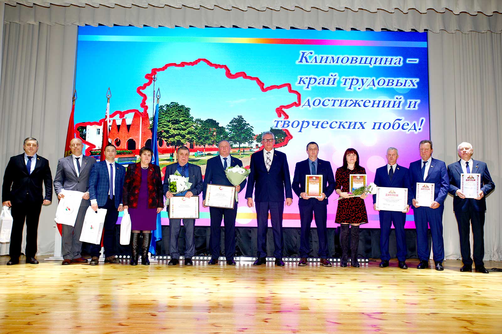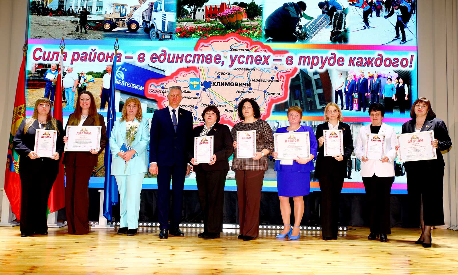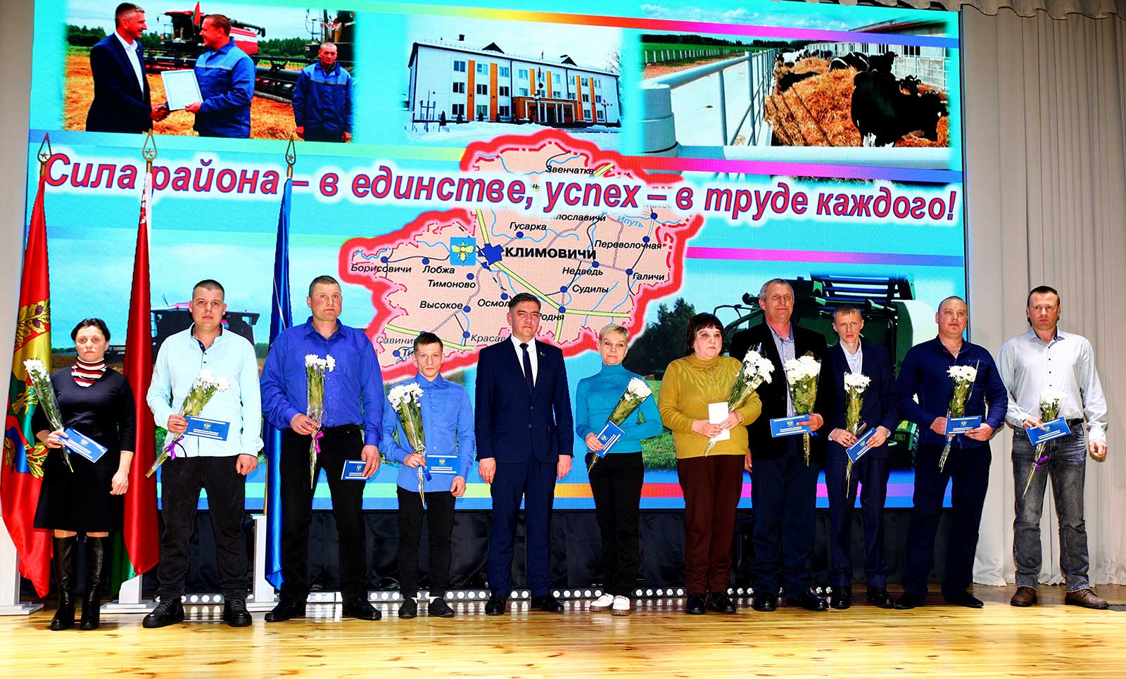 — Сегодня в этом зале собрались лучшие из лучших, — подчеркнул глава района. — Люди, чьим трудом крепнет наша родная Климовщина. Слет передовиков — это не просто подведение итогов, это чествование преданности делу, профессионализма и искренней любви к своей земле, это праздник всех жителей района, дань уважения ветеранам труда и молодому поколению.