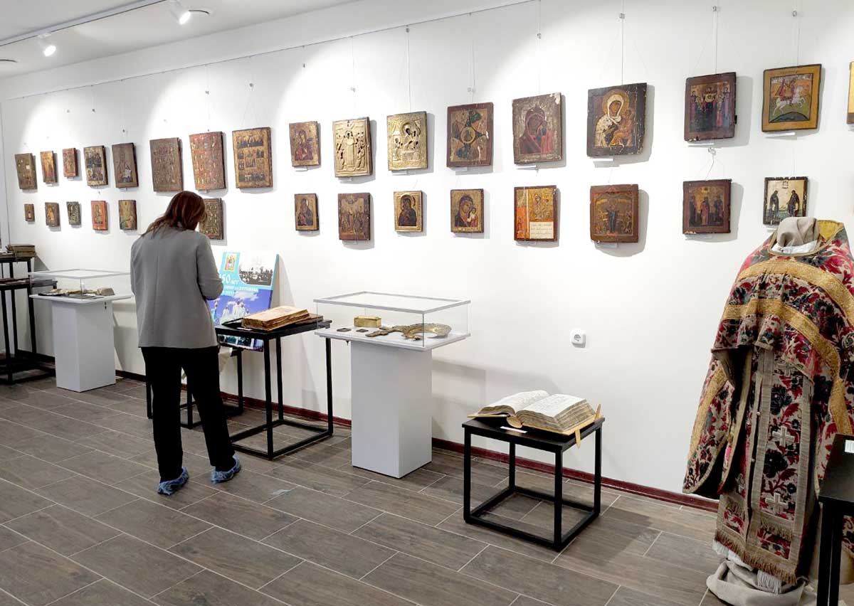 Выставка включает в себя экспозиции сакрального искусства. В них представлены иконы и предметы церковного обихода.