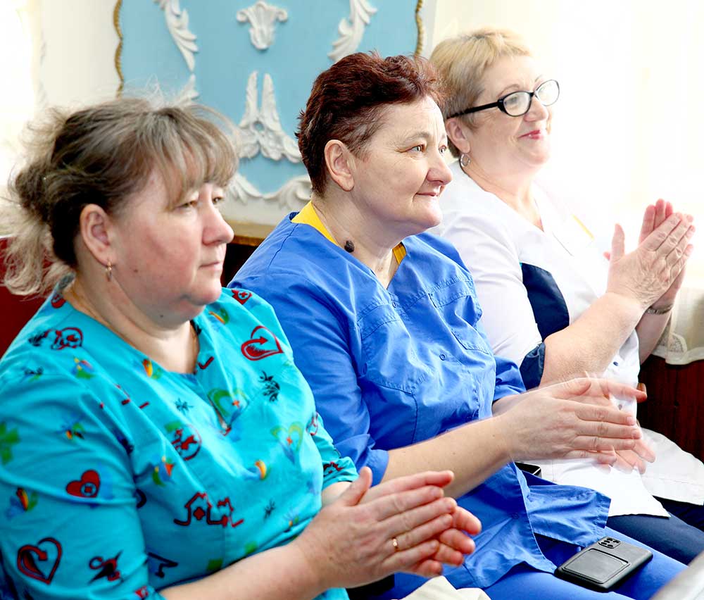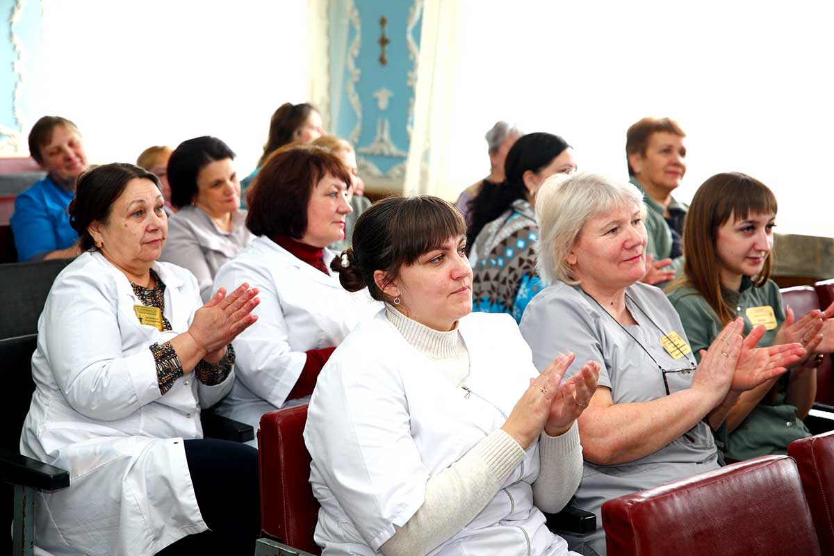 Женщины, работающие в больнице, принимали поздравления с улыбками, а музыкальные номера стали для них приятным сюрпризом в преддверии 8 Марта.
